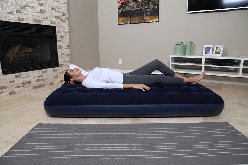 Верхняя поверхность имеет флокированное покрытие, приятное на ощупь и напоминающее велюр. Оно предотвращает соскальзывание постельного белья и легко очищается без применения специальных средств. Универсальный клапан позволяет использовать любой тип насоса — ручной, ножной или электрический (насос в комплект не входит).
